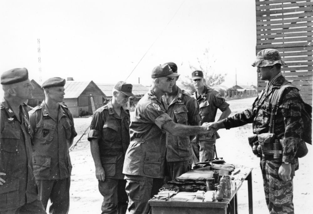 L to R: Col Francis J. Kelly (5th SF Grp CO), Maj Edward S. Rybat (Commandant MACV Recondo School), Lt. Gen. Stanley R. "Swede" Larsen, Gen. Westmoreland, unk?, CPT William S. Napalm Carpenter (Gen. Westmoreland's Aide - facing camera wearing baseball cap), Joe C. Alderman (Project Delta Recon, far right, shaking hands with Gen. Westmoreland)